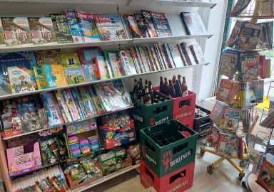 Lottoterminal, Fahrkartenterminal, Kaffeemaschine, Scannerkasse (Cloud-Lösung), diverse Regale für Tabak, Zeitschriften, Karten, usw. Der Bodenbelag ist Linoleum.